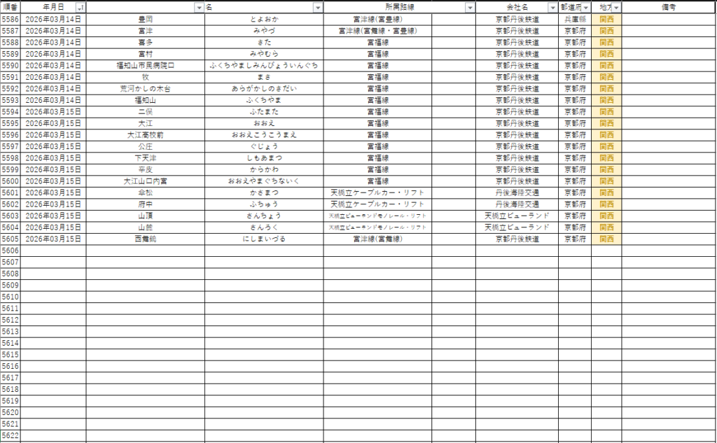 関西地區の在來線は東海道本線・山陰本線・山陽本線・紀勢本線・大阪環状線・姫新線を除くJR西日本全線全驛の訪問が完了。この期間だけで300驛以上降りるに至った。